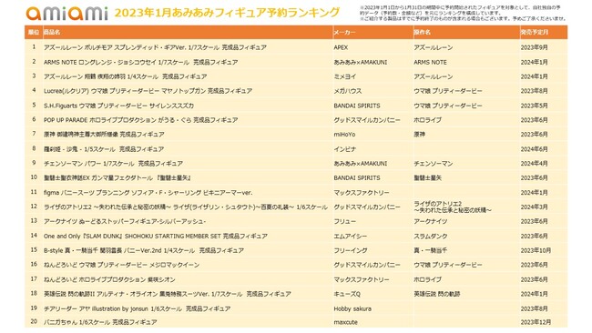 ホビーショップ『あみあみ』の「2023年1月フィギュア予約ランキング」を発表!