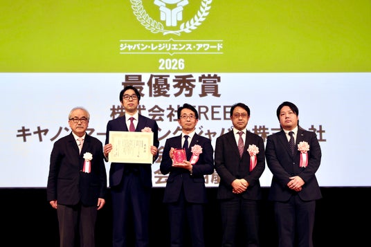 キヤノンマーケティングジャパン株式会社(代表取締役社長:足立 正親、以下キヤノンMJ)と株式会社FREE(代表取締役:高橋 友二、以下FREE)は、一般社団法人レジリエンスジャパン推進協議会(所在地:東京都千代田区、会長:広瀬道明、以下レジリエンスジャパン推進協議会)が主催する「ジャパン・レジリエンス・アワード(強靱化大賞)2026」において、株式会社長大、株式会社翔慶などのパートナー企業とともに「最優秀賞」を共同受賞しました。各社で連携し推進する空気製水機を中核とした水循環型ソリューションの社会実装に向けた取り組みが高く評価され、今回の受賞に至りました。