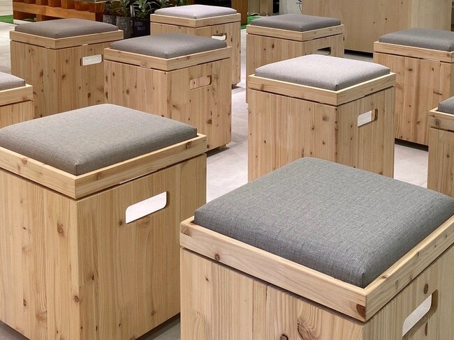 お買い物の合間に荷物の整理や休憩にご利用いただけるレストスペースには、阪急うめだ本店の建て替え工事中に土中から出てきた木材を一部使用。保管していた倉庫の移転に伴い廃棄されるはずだったものに新たな役割を持たせました。一部の椅子には、阪急阪神百貨店全店から回収した、廃棄予定だった衣料をアップサイクルした資材を使用しています。
