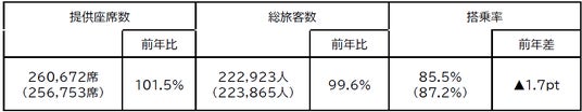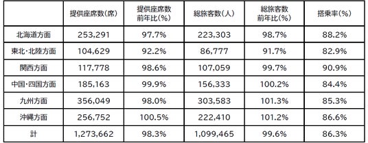 ● 方面別では、北海道、関西、中国・四国、九州、沖縄方面にて前年を上回る搭乗率となりました。