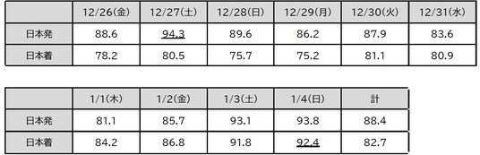 ● 総旅客数は前年並みとなりました。日別のピークは、日本出発は12月27日、日本到着は1月4日でした。