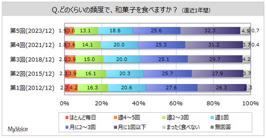 マイボイスコム株式会社(東京都千代田区、代表取締役社長:高井和久)は、5回目となる『和菓子』に関するインターネット調査を2023年12月1日~5日に実施しました。好きな和菓子や食べる頻度、イメージなどを聞いています。調査結果をお知らせします。