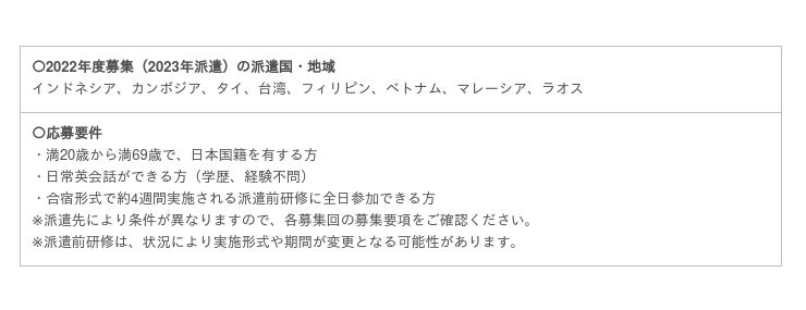 募集期間は~9月14日(水)まで、派遣先国はタイ、インドネシア、ラオス