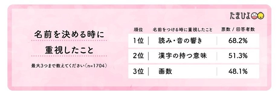 昨年と同様に1位「読み・音の響き」、2位「漢字の持つ意味」、3位「画数」となりました。「読み・音の響き」が名づけで最も重視する項目であることは変わらず、「漢字の持つ意味」を重視する傾向は、初めて50%を超えました。