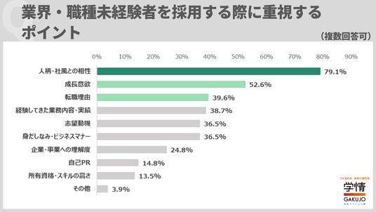 株式会社学情(本社:東京都中央区)は、企業・団体の人事担当者を対象に、キャリア採用における「業界・職種未経験者の採用」についてインターネットアンケートを実施しました。業界・職種未経験者を採用する際に重視するポイントは、「人柄・社風との相性」が79.1%と8割近くに。次いで、「成長意欲」52.6%、「転職理由」39.6%、「経験してきた業務内容・実績」38.7%が続きました。「人柄・社風との相性」が突出しており、相性やカルチャーフィットを重視して採用する企業が多いことが分かります。業界・職種未経験者を採用する際に評価している経験や能力・スキルでは、「コミュニケーション能力」が9割に上り、ほとんどの企業が必須の能力と考えていることが分かりました。
