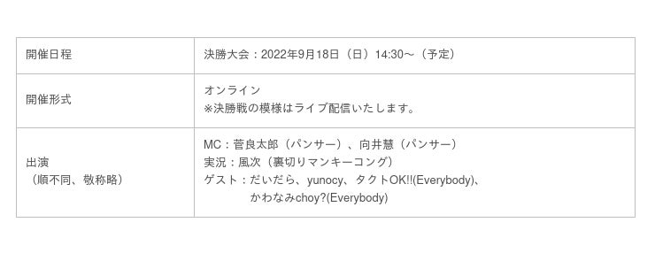 決勝大会のMCはお笑いトリオ「パンサー」の菅良太郎さんと向井慧さんが務めます。どんなトークが飛び出すのか、お二人のMCにもご注目ください。