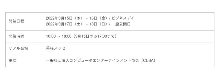 【「東京ゲームショウ2022」公式サイト】https://tgs.cesa.or.jp