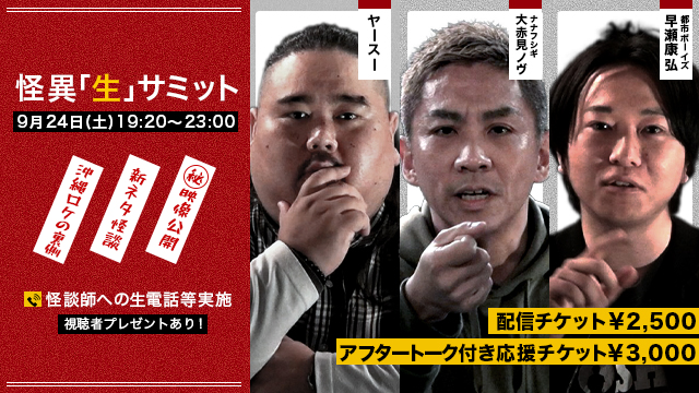 『怪異「生」サミット』が9月24日(土)に開催されることが分かった。時間は19時20分から23時までと、3時間半以上の規模で開催される。