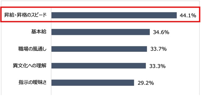 今後も日本で働きたいと回答した人に、希望する雇用形態を聞いたところ、最も高かったのは「正社員」で74.2%だった。また、日本で働いてみて改善が必要だと感じた点は「昇給・昇格のスピード」44.1%、次いで「基本給」が34.6%となった。