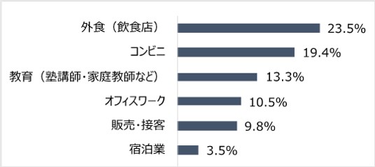 現在のアルバイトの職種を聞いたところ、最も多かったのが[外食(フード)]23.5%、次いで[コンビニ]19.4%、[教育(塾講師・家庭教師など)]13.3%となった。一方、やってみたい職種を聞いたところ、最も多かったのは[オフィスワーク]29.8%、次いで[教育(塾講師・家庭教師など)]27.0%、[外食(飲食店)]21.0%となっており、現在の職種と希望の職種の順位にギャップが見られた。
