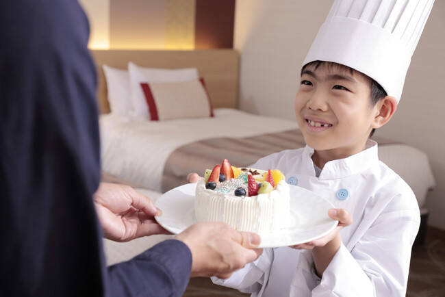 本プランでは、お部屋の冷蔵庫に当ホテルパティシエ特製ケーキのベースとデコレーションパーツを事前に準備し、お子様用のホテルオリジナルコックコートを1室につき1着貸し出します。親子で一緒にこどもの日を楽しくお祝いし、日頃なかなか伝えられない感謝の気持ちが届けられるオリジナルデコレーションケーキが作れます。