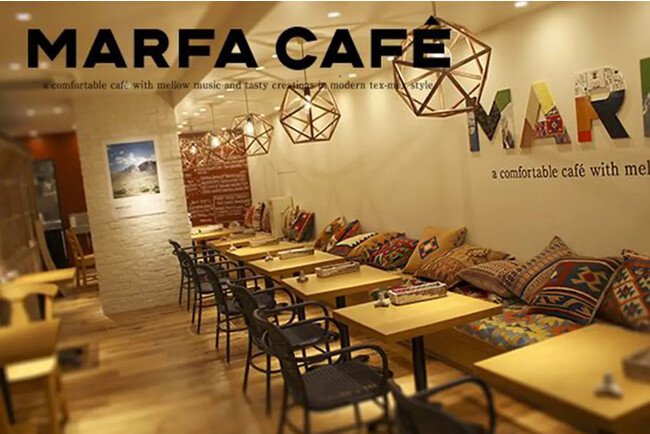 MARFA CAFEはアメリカ西海岸とメキシコのカルチャーとアートがMIXした”MODERN TEXMEX STYLE”がコンセプトのカフェ。本物のサボテンや絨毯クッション、店内装飾の細部にまでこだわった店内は、居心地のいいカフェを演出しています。ゆったりとくつろぎながら、ひとつひとつこだわったMARFA CAFEのフードやドリンクをお楽しみください。