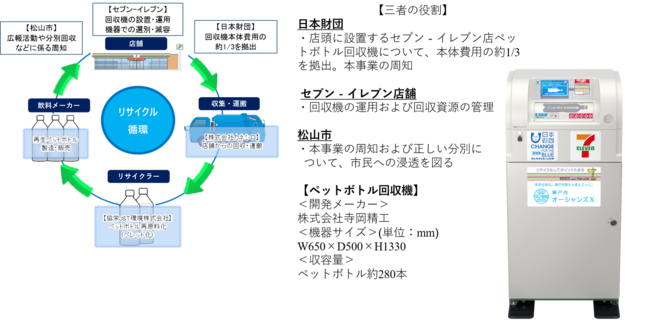 瀬戸内海に面する4県(岡山県、広島県、香川県、愛媛県)との包括的海洋ごみ対策プロジェクト「瀬戸内オーシャンズX」を推進する日本財団は、プラスチック対策の一つとして『ペットボトル回収機』の設置を進めている株式会社セブン-イレブン・ジャパンと、海洋プラスチックごみの流出を防ぐべく、継続して取り組んできた松山市に賛同し、産官民が連携する本取り組みが実現いたしました。