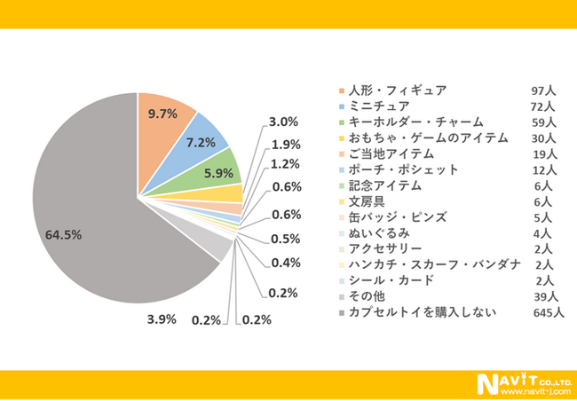 「どのような種類を購入しますか?」という質問については、「人形・フィギュア」が9.7%、「ミニチュア」が7.2%という結果になり、集めて飾って楽しむことができるものが上位になりました。