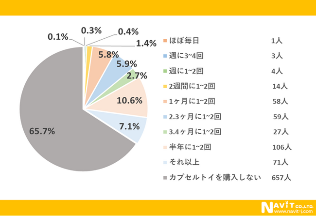 「どのくらいの頻度で購入しますか?」という質問については、「半年に1~2回」が10.6%、「2、3ヶ月に1~2回」が5.9%、「2、3ヶ月に1~2回」が5.8%と続く結果になりました。