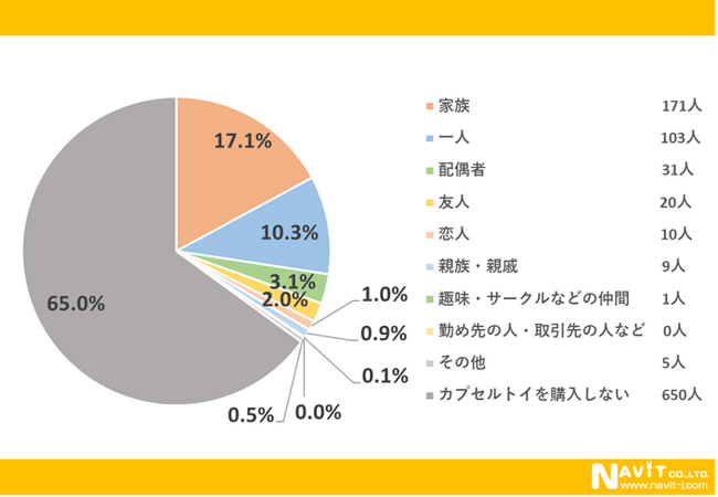 「誰と購入しに行きますか?」という質問については、「家族」が17.1%、「一人」が10.3%という結果になりました。家族とみんなで楽しむことができる、趣味として一人で楽しむことができるといったように、ガチャガチャの強みが結果に表れました。