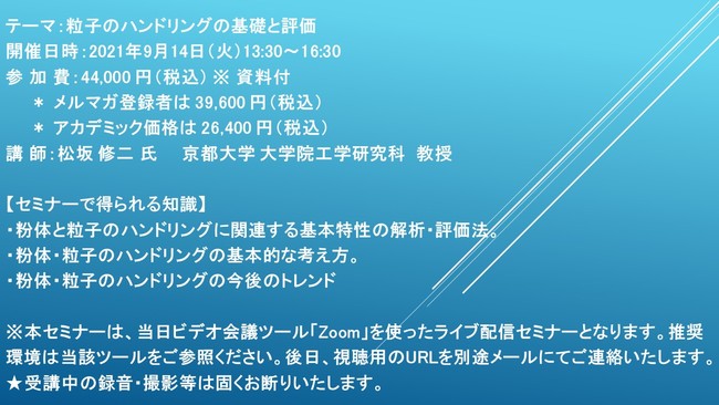 先端技術情報や市場情報を提供している(株)シーエムシー・リサーチ(千代田区神田錦町: https://cmcre.com/ )では、 各種材料・化学品などの市場動向・技術動向のセミナーや書籍発行を行っておりますが、 このたび「粒子のハンドリングの基礎と評価」と題するセミナーを、 講師に松坂 修二 氏 京都大学 大学院工学研究科 教授)をお迎えし、2021年9月14日(火)13:30より、 ZOOMを利用したライブ配信で開催いたします。 受講料は、 一般:44,000 円(税込)、 弊社メルマガ会員:39,600 円(税込)、 アカデミック価格は26,400 円(税込)となっております(資料付)。