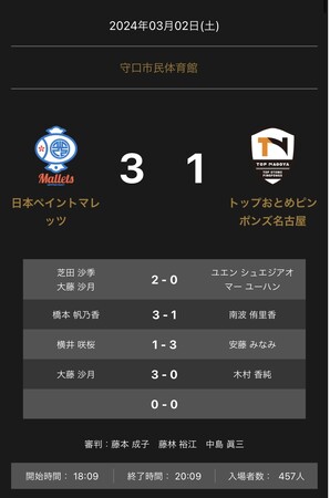 2024-03-03 一般社団法人Tリーグ ノジマ リーグ 2023-2024シーズン 公式戦 3月2日開催 日本ペイントマレッツvsトップおとめピンポンズ名古屋 試合結果 Tweet 日本ペイントマレッツとトップおとめピンポンズ名古屋の試合は、3-1で日本ペイントマレッツが勝利しました。 企業プレスリリース詳細へ PR TIMESトップへ 公式ツイッター Follow @Straightpress 最新情報をTwitterで受け取ろう! 公式フェイスブックページ 最新情報をFacebookで受け取ろう! 前の記事 一覧へ戻る 次の記事