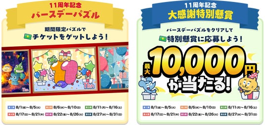 誕生祭キャンペーンの詳細に加え、「パズルde懸賞」シリーズのこれまでの歩みや実績、さらにユーザーの皆さまから寄せられた“アプリとの思い出エピソード”なども掲載。ユーザーの皆さまとともに歩んできた11年間を振り返る内容となっています。