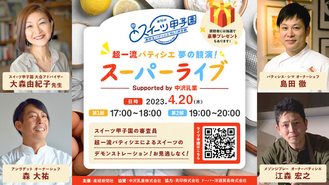 スイーツ甲子園を主催する産経新聞社は、2023年4月20日(木)17時からYouTube Liveで「超一流パティシエ 夢の競演! スイーツ甲子園 スーパーライブ」をオンライン開催します。【視聴URL】 https://sweets-koushien.com/live/superlive_2023.html