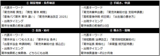 さらに、検索キーワードを検索意図別に整理したところ、関心は大きく4つのテーマに分類できました。育休の取得が促進される中で、情報を調べている様子が浮かびます。
