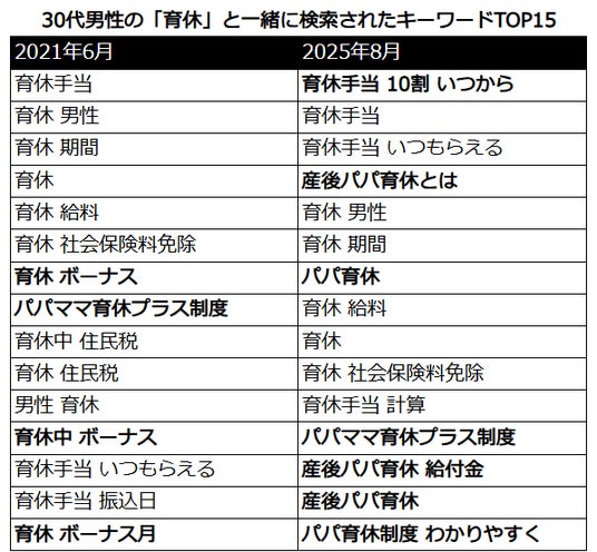 LINEヤフーの保有する検索・人流データをもとに、人々の興味関心を分析できるデスクリサーチツール「DS.INSIGHT」を活用し、30代男性が「育休」と一緒に検索したキーワードを抽出しました。その結果、2021年6月時点で「育休」と共に検索されたのは「ボーナス」「住民税」など収入への影響に関するキーワードが見られました。一方、2025年8月では手当や制度に関する検索が中心となっていました。