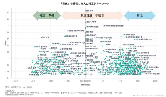 2024年9月から2025年9月までに「育休」を検索した人の検索行動を時系列で分析すると、多くの人が「産休 計算」や「育休中 年末調整」などの“確認・準備”から、「出産手当金 申請期間」「産後パパ育休」「育休手当 条件」などの“制度理解・手続き”を経て、実際の“育児”という流れで関心を移しています。また、制度を理解し、必要な手続きを終えるまでには、およそ1週間から1か月程度を要していることも推測できます。