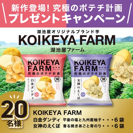 「うまい芋で作れば、うまいポテトチップスになる。」という思いのもと、ポテトチップスの原料である日本産じゃがいもを育む畑から商品になるまでをトータルコーディネートすることにより、日本産じゃがいものブランド化・価値向上を目指すプロジェクト「KOIKEYA FARM」。いよいよ本格始動する「KOIKEYA FARM」ブランドから、「白金ダンディ」「女神のえくぼ」の2種の湖池屋オリジナルブランド芋を使用した商品が店頭発売されることを記念し、「KOIKEYA FARM」2品がセットで当たるキャンペーンを実施します。フォロー&リポストの簡単応募ですので、みなさまぜひご参加ください。