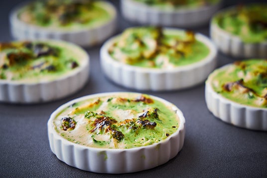 冷たい海で身の締まった“富山県産真タラ”とコリコリした歯ごたえの“つぶ貝”に、ガーリック風味のブルギニヨンバターソースをかけ、焼き上げました。魚介の味わいとバターのコクが相性抜群な一品を、ぜひ熱々の状態でお召し上がりください。