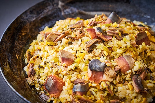 “九頭竜まいたけ”の味・香り・歯ごたえを堪能いただける、中国料理のシェフ特製ふかひれ入りあんかけを、中華おこげにかけてお召し上がりいただきます。香ばしい香り、パリパリのおこげ、あんのとろりとした食感をご一緒にお楽しみください。