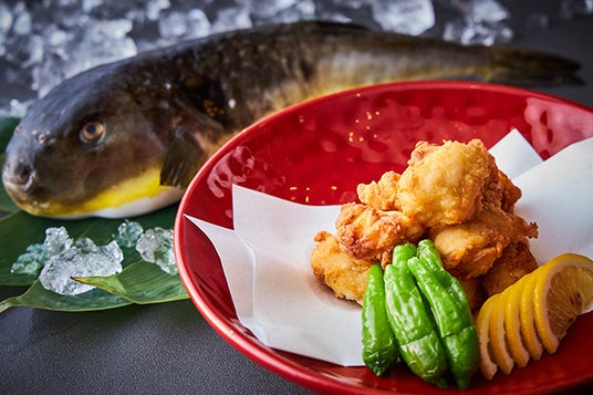 日本料理からは、石川県の郷土料理である「めった汁」をご用意いたします。さつまいもや大根、人参といった根菜類やこんにゃく、長ねぎなどを使用し、具だくさんで食べ応えのある一品です。また、”もみじ麩”が秋らしい「福井県産サゴシのごま柚庵焼き」は、脂ののりがよい福井県産サゴシを、ごまと柚子の風味が上品な庵に漬け込み、焼き上げました。この時期に日本海側のみで漁獲されている、あっさりした味わいの石川県産ゴマフグは、醤油をベースに味付けした唐揚げでご提供いたします。