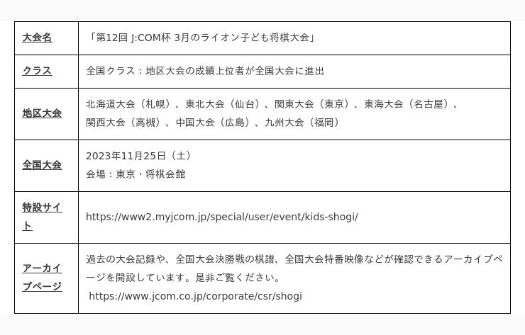 ◇6月 :J:COM杯 3月のライオン子ども将棋大会の参加者募集開始。7月~10月にかけて地区大会を開催。