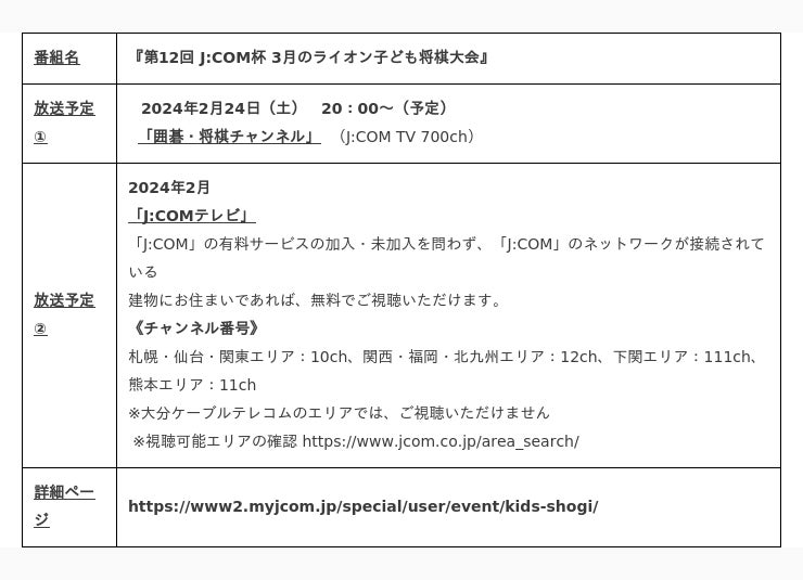 決勝戦の模様は2024年2月24日(土)20時より「囲碁・将棋チャンネル(J:COM TV 700ch)」、同月にJ:COMのコミュニティチャンネル「J:テレ」(J:COM テレビ)で放送します。