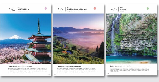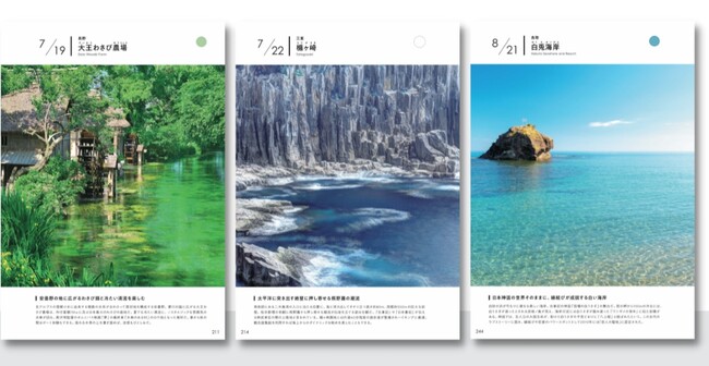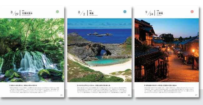 1月1日から12月31日まで。四季を追いながら毎日眺めて楽しめる構成で、日本全国の知られざる絶景スポットをご紹介しています。その土地の最も美しい瞬間をとらえた美麗写真の数々に酔いしれてください。