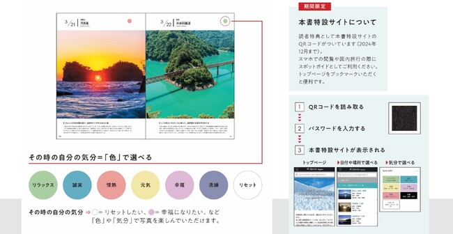 本書に掲載した写真を、パソコンやスマホからテーマごとに検索して眺められる特設サイトもオープンいたします(2024年12月末まで)。本書に記載しているパスワードを入力して頂くことで、いつでもどこでもお手持ちの端末から絶景写真を楽しむことができます。旅先でのスポットガイドとしてもお役立てください!