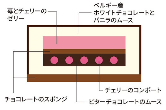 細部までこだわった立体的なケーキを、新テイストでご用意します。苺とチェリーのゼリー、チェリーコンポートが入ったビターチョコレートムースをベルギー産ホワイトチョコレートを使用したバニラムースで包み、チョコレートスポンジの上に重ねました。ほどよい酸味のゼリーと、なめらかな口当たりのムースをお楽しみいただけます。