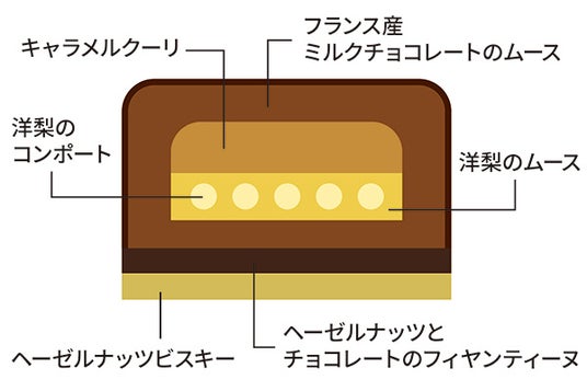 洋梨のコンポート、洋梨ムース、キャラメルクーリを、ミルクチョコレートムースで包みました。サクサクなヘーゼルナッツビスキーやフィヤンティーヌとの相性も抜群です。フランス産ヴァローナ社のチョコレート「キャラメリア」を使用した、甘さ控えめながら濃厚なテイストをお楽しみください。