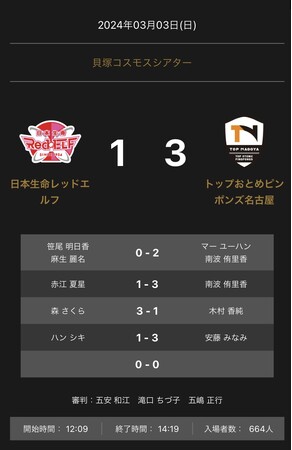 2024-03-03 一般社団法人Tリーグ ノジマ リーグ 2023-2024シーズン 公式戦 3月3日開催 日本生命レッドエルフvsトップおとめピンポンズ名古屋 試合結果 Tweet 日本生命レッドエルフとトップおとめピンポンズ名古屋の試合は、3-1でトップおとめピンポンズ名古屋が勝利しました。 企業プレスリリース詳細へ PR TIMESトップへ 公式ツイッター Follow @Straightpress 最新情報をTwitterで受け取ろう! 公式フェイスブックページ 最新情報をFacebookで受け取ろう! 前の記事 一覧へ戻る 次の記事