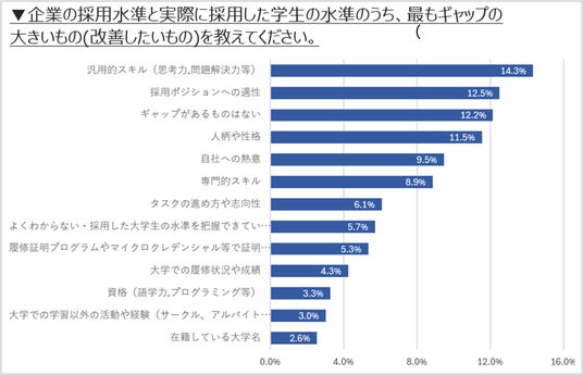 ベネッセi-キャリアが運営するシンクタンク「まなぶとはたらくをつなぐ研究所」が行った調査※3では、企業・大学ともに思考力や問題解決力といった学生の「汎用的スキル」を重視している(右図1)一方で、入社後に企業が最もギャップを感じていることも「汎用的スキル」である(右図2)ことがわかりました。