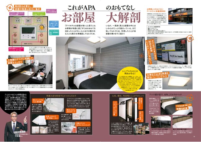 誌面ではアパホテルの歴史をはじめ、社長・元谷芙美子氏のインタビュー、ホテル評論家・瀧澤信秋氏が語るアパホテルの魅力、アパホテルで味わえる充実のご当地グルメ&豪華朝食紹介など、業界No.1の秘密を徹底紹介。思わず行きたくなってしまう情報が満載です。