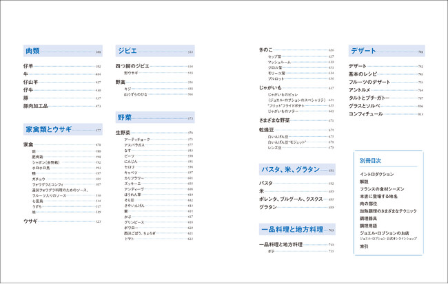 本書の特徴は、料理のカテゴリー別だけでなく、素材別にあらゆるレシピを検索できる点です。