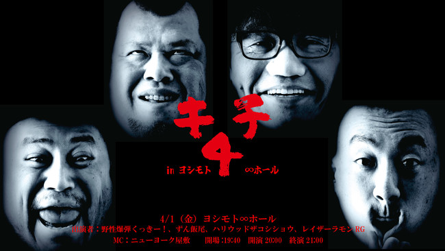 この度、野性爆弾くっきー!、ずん飯尾、ハリウッドザコシショウ、レイザーラモンRGという強烈な個性を持った4人による『キチ4 in ヨシモト∞ホール』をエイプリルフールである4月1日(金)に開催いたします。