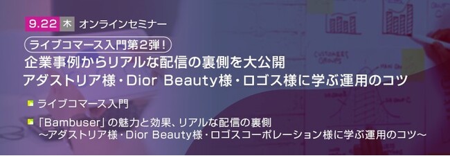 本セミナーでは「ライブコマース入門 第2弾」と題しまして、企業様の具体事例にフォーカスし運用・配信の裏側をご紹介します。EC / D2Cビジネスを始めとして数多くのEC運用オペレーションをサポートしてきた「トランスコスモス」と、ライブコマースの世界的リーディングカンパニーである「Bambuser」が、ライブコマースの今と運用のコツをお伝えします。