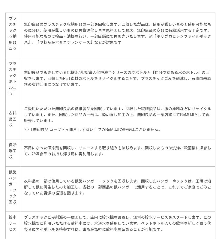 以下は「無印良品 コープさっぽろ しずない」で導入する環境に配慮した主な活動になります。