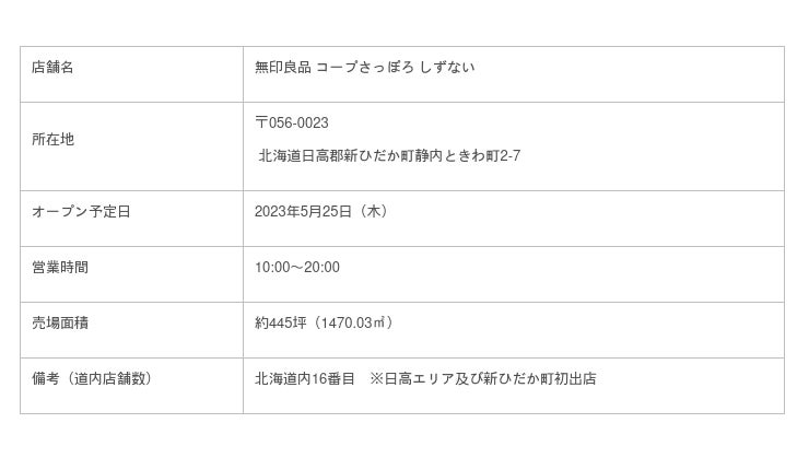 無印良品を展開する株式会社良品計画(東京都豊島区/代表取締役社長:堂前 宣夫)は、北海道日高郡新ひだか町のスーパーマーケット「コープさっぽろ しずない店」に隣接した、「無印良品 コープさっぽろしずない」を5月25日(木)にオープンします。日高エリアで初出店、北海道内では16店舗目の出店となります※1。