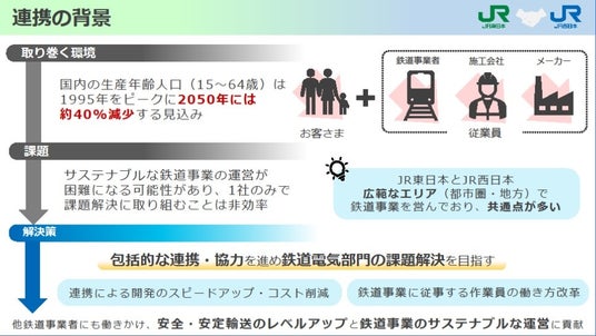 その中で、JR東日本とJR西日本は広範な事業エリア(都市圏・地方エリア)を担当しており、共通の課題が多いと考えたため、両社で相互に連携・協力して、鉄道電気部門の課題解決に取り組んでいきます。