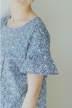 バスト位置にほどこされたギャザーや袖口のフリルが、バラのパターンと相まって女性らしさを演出してくれます。