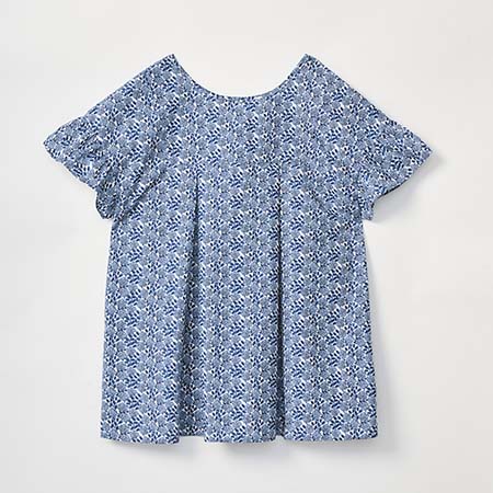 シンプルなコーディネートに投入すれば、たちまち洗練された印象になる、清涼感のあるカラーの総柄ブラウス。