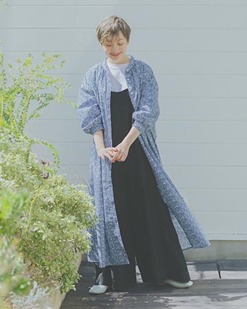 総柄の華やかなワンピースとしても、フロント部分のボタンを全開にすればアウターとしても使える2WAYタイプ。