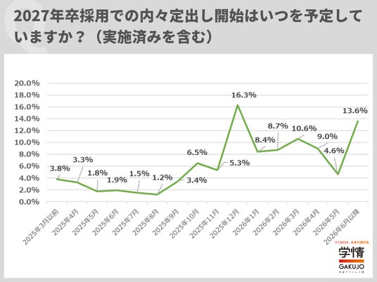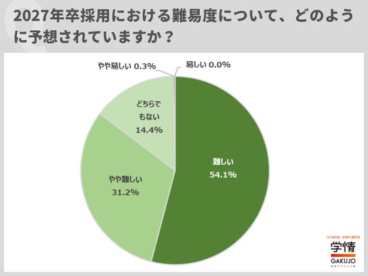 株式会社学情(本社:東京都中央区)は、企業・団体の人事担当者を対象に2027年卒採用に関するインターネットアンケートを実施しました。2027年卒採用の難易度について「難しい」と予想する企業が8割を超え、大半の企業が難易度が上がるとみています。「早期化・長期化が極端に表れ対応が難しい」「学生優位、大企業志向の強まり」「内定承諾後辞退が当たり前に」「学生のコミュニケーション能力、人間力が低下」といった声が寄せられました。また、2027年卒採用が「早期化する」とした企業は9割に迫りました。選考開始予定は「2025年10月」の15.2%が最多で、2025年内に始めるとした企業が6割近くに上りました。内々定出しの開始予定は「2025年12月」が16.3%で突出。半数近い企業が2025年のうちに内々定を出し始める予定で、早期化がさらに進むのは確実な情勢です。